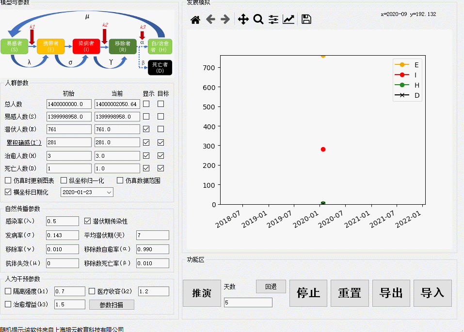 Ø 总人数/易感人数:14亿(医学统计为人群普遍易感),直接输入14e8回车。该参数对于目前传染人数来说由于足够大,该参数对于模型推演影响微小