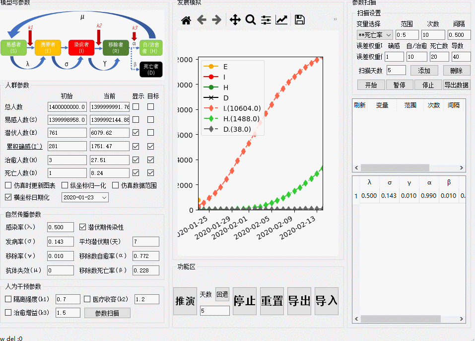 Ø 感染率(λ):每个携带者或染病者日均感染人数;可用R0/平均潜伏天数来设置。根据初期R0=3,平均潜伏天数为3(见潜伏人数设置中),可填入参数1。【该参数可使用扫描功能选定一个最优值】