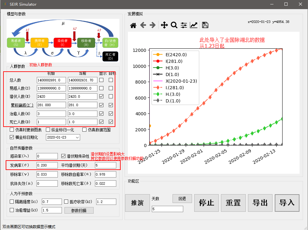 为方便比对,可导入全国除湖北IHD的文本数据(I确诊、H治愈、D死亡,txt文本每行包含这三个数据即可导入软件,也可联系作者获取python脚本来自动抓数据保存)。对于仿真功能来说,这不是必要的