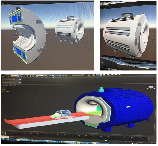 机架和仿真人体模型按一定比例缩小至系统场景中。检查床支持手动、软件控制及与临床核磁仿真软件联动,配备可控的水平和垂直定位灯,可设置进床 0 位置,具备一键进床至定位中心或退出功能,液晶实时显示床位,可实现头颈部、胸腹部等多部位的多种摆位操作。